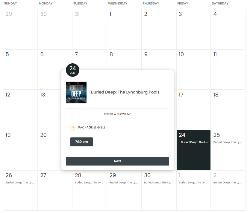 Click on the date for any performance you would like to attend, click to choose your time, then click NEXT